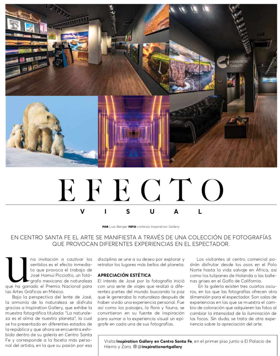 Bajo la perspectiva del lente de José, la armonía de la naturaleza se disfruta gracias a Inspiration Gallery, que exhibe la muestra fotográfica titulada: “La naturaleza es el alma de nuestro planeta”, la cual se ha presentado en diferentes estados de la república y que ahora se encuentra exhibida dentro de su galería en Centro Santa Fe y corresponde a la faceta más personal del artista, en la que su pasión por esa disciplina se une a su deseo por explorar y retratar los lugares más bellos del planeta.